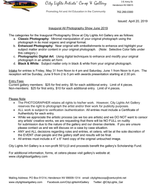 Since this is the gallery's Inauguarl Photography please email the completed Entry Form to Eric Courtne at edc856@gmail.com so that we can have an idea on how many artists we can expect.